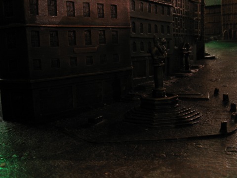 Das Modell der Umgebung des Marktplatzes steht neben dem Marktbrunnen.