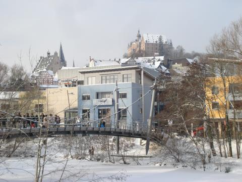 Die Luisa-Haeuser-Brücke über der zugefrorenen Lahn